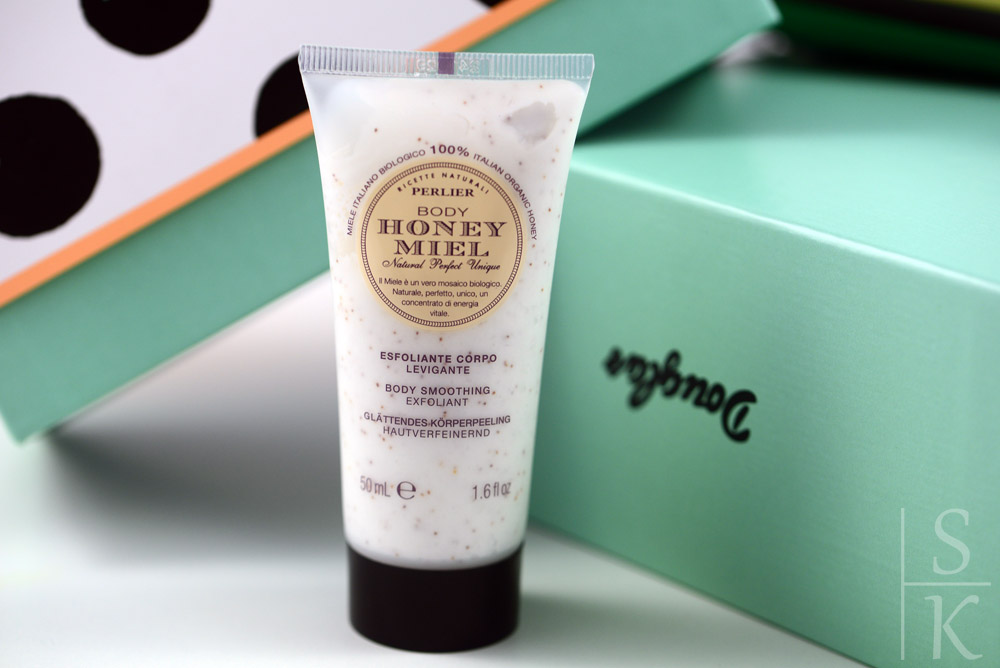 Einzig bei diesem Körperpeeling von Perlier handelt es sich mit 50ml um eine Probe. Obwohl das Produkt aber Honey Miel heißt und sogar mit Honig sein soll, riecht es irgendwie gar nicht danach. Für mich duftet es nämlich eher blumig, allerdings nehme ich trotzdem auch eine angenehme süße war – Ich habe zwar keine Ahnung warum, aber aus irgendeinem Grund, hat der Duft mich sofort an meine Schwester erinnert. Dafür hat es aber richtig tolle Peeling-Perlen, die auf der Haut einen angenehmen Massage-Effekt haben. Ich habe noch etliche Peelings zu Hause herumstehen, deshalb bin ich froh, dass es sich dabei nur um eine Luxusprobe handelt, obwohl ich natürlich auch nichts gegen die Originalgröße gehabt hätte.