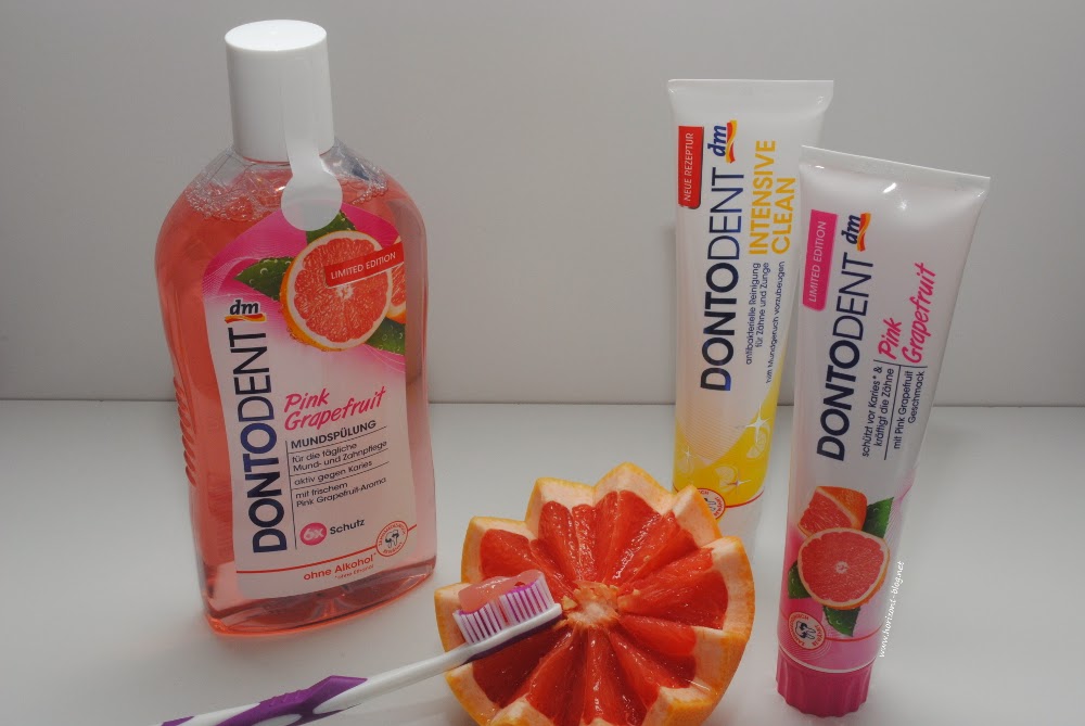 Ich bin kein großer Fan von Minze, gerade was Zahnpflege betrifft. Oft sind mir zu minzhaltige Zahncremes einfach zu scharf – Ein frisches Gefühl im Mund ist ja ganz angenehm, aber nicht wenn es brennt. Aus diesem Grund werfe ich auch immer ein Auge auf die limitierten Editionen von Dontodent, doch leider konnte mich die aktuelle „Pink Grapefruit“ – LE* geschmacklich nicht so überzeugen. Sie schmeckt zwar fruchtig und der Minzgeschmack ist wirklich nicht zu dominant, aber man muss es schon mögen und ich muss gestehen, dass ich Grapefruit zum ersten Mal bewusst nach dem Bild oben gegessen habe… Jetzt weiß ich zumindest, dass das nichts für mich ist 😉 Das hat aber damit nichts zu tun, dass sowohl die Zahnpcreme als auch die Mundspülung ihren Zweck, soweit ich das beurteilen kann, erfüllen.